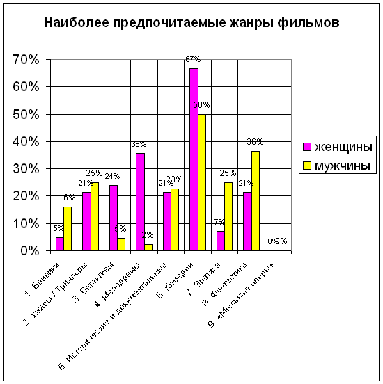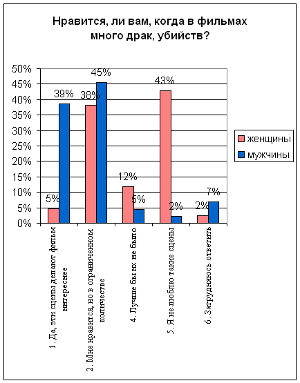 Диаграмма 2 Так, по данным исследования наиболее предпочитаемым жанром в исследуемых группах молодежи являются комедии. Этот жанр по распространенности выбора оказался на первом месте, как у юношей, так и у девушек, он лидирует среди всех возрастов молодежи. Такую популярность комедийного жанра можно объяснить тем, что телевидение для молодежи является в первую очередь средством развлечения. А вот второе место разделилось в зависимости от пола. Девушки выбирают мелодрамы, а юноши фантастику. Жанр мелодрамы имеет достаточно высокий рейтинг у девушек и низкий у мужчин. Оба жанра имеют динамику развития, от менее предпочитаемых, к более предпочитаемым, в зависимости от возраста. Третье место заняли ужасы и триллеры (23%). Популярность фильмов ужасов для значительной части молодежи вполне понятна: в данном возрасте у людей существует потребность в острых ощущениях. Рейтинг триллеров не сильно зависит от пола, хотя мужчины предпочитают такие фильмы чуть больше. Однако большинство триллеров, как известно, включает сцены насилия, поэтому их популярность вызывает озабоченность. Чуть отстают от триллеров исторические и документальные фильмы (22%), следующим по популярности жанром фильмов являются эротика (16%). Следует сказать, что проблема взаимосвязи эротики с агрессивным поведением зрителей также является достаточно актуальной. Так, проведенные Р. Бероном исследования показали, что такая связь существует, однако она не является линейной. В частности, было выявлено, что умеренное сексуальное возбуждение, вызванное продукцией эротического содержания, уменьшает агрессию. Однако откровенно сексуальные сцены провоцируют сильное возбуждение, повышают вероятность проявления агрессивного поведения. Дальнейшие исследования показали, что данная закономерность действует как в отношении мужчин, так и в отношении женщин. В целом, на данный момент выделяют две основные модели влияния эротических сцен на зрителя. Согласно первой модели, пересмотр фильмов эротического содержания вызывает катарсический эффект, позволяет реализовать вытесненные сексуальные фантазии. Согласно другой модели, просмотр эротических сцен стимулирует сексуальную агрессию. Боевики, как ни странно, пользуются наименьшей популярностью, причем предпочтение подобным фильмам отдают в основном мужчины. Таким образом, можно было бы сделать вывод, что молодежь в основном не любит смотреть сцены насилия, но это этот вывод полностью опровергает ответ на следующий вопрос.