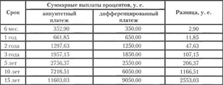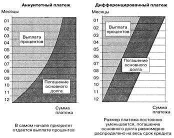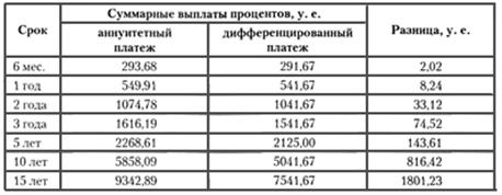Рис. 1.1 Схема аннуитетного и дифференциального платежей Большинство банков применяют все же аннуитетные платежи, аргументируя свой выбор тем, что это удобнее для заемщиков – не надо думать, какую сумму вносить в каждом следующем месяце. Это верно лишь отчасти. Даже в случае дифференцированных выплат ничто не мешает заемщику ежемесячно выплачивать банку равную сумму, ведь проценты в любом случае будут начисляться на остаток задолженности (но при этом «тело долга» будет убывать быстрее). Существует другой важный аргумент в пользу аннуитетных выплат. В самом начале погашения долга именно аннуитет более комфортен для заемщика (см. графики выплат). Необходимо отметить, что для небольших краткосрочных кредитов разница в способе погашения кредита – аннуитетными или дифференцированными платежами - практически не ощущается. Она становится более заметной при увеличении срока кредита и при более высокой процентной ставке. Пример 2. Сколько денег заплатит заемщик, выплачивая кредит в 10 тыс. у. е., взятый на разные сроки и под разные ставки? Один из банков предлагает ему погашать долг аннуитетными выплатами, другой – дифференцированными. Для решения задачи подсчитаем суммарные выплаты процентов при погашении кредита двумя упомянутыми выше способами (для одинаковой суммы кредита, но для разных сроков и ставок). Результаты вычислений представлены в таблицах. Таблица 1 Сумма кредита: 10 тыс. у. е. Ставка: 10 % годовых
