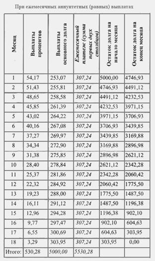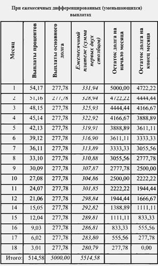 где ЕП – размер ежемесячного платежа; СК – сумма кредита; ПС – годовая процентная ставка; КМ – количество месяцев (срок, на который выдан кредит). Как было сказано выше, ежемесячный аннуитетный платеж складывается из двух составляющих – возвращения основного долга и начисленных процентов: ЕП = ВОД + ЕПВ, (2) где ВОД – возврат основного долга; ЕПВ – ежемесячные процентные выплаты. На этом сходство в подходах банков заканчивается, и начинаются различия. Состоят они в подходах к вычислению суммы причитающихся процентов. Основных подходов два, разница – в используемой временной базе. Часть банков исходят из того, что «в году 12 месяцев», и тогда размер ежемесячных процентных выплат определяется по формуле: ЕПВ = ОЗ где ЕПВ – ежемесячные процентные выплаты; ОЗ – остаток задолженности в данном месяце; ПС – годовая процентная ставка. Часть банков исходит из того, что «в году 365 дней» и такой подход называется расчетом точных процентов с точным числом дней ссуды. Размер ежемесячных процентных выплат в данном случае определяется по формуле: ЕПВ = ОЗ • ПС • где ЕПВ – ежемесячные процентные выплаты; ОЗ – остаток задолженности в данном месяце; ПС – годовая процентная ставка; ЧДМ – число дней в месяце (понятно, что это число меняется от 28 до 31). Для того чтобы вычислить сумму возврата основного долга, необходимо из суммы ежемесячного аннуитетного платежа (размер которого остается неизменным) вычесть размер процентных выплат в данном месяце: ВОД = ЕП – ЕПВ. 1.2 Ежемесячный дифференциальный платеж Он также складывается из двух составляющих – возвращения основного долга и процентных выплат (процентные выплаты вычисляются по приведенной выше формуле). Каждый месяц сумма основного долга уменьшается на одинаковое число (сумма кредита, деленная на количество месяцев). Из-за постоянного уменьшения суммы долга уменьшается и размер процентных выплат, а с ними и ежемесячный платеж. Формула расчета дифференцированного платежа выглядит следующим образом (разница – в точности подсчета дней в месяце): ЕП = или ЕП = где ЕП – размер ежемесячного платежа; СК – сумма кредита; КМ – количество месяцев (срок, на который выдан кредит); ОЗ – остаток задолженности в данном месяце; ПС – годовая процентная ставка; ЧДМ – число дней в месяце (от 28 до 31). Как определить, какой способ погашения является более выгодным? Рассмотрим конкретный пример. Пример 1. Банк А предлагает кредит в 5 тыс. у.е. на 18 месяцев под 13 % годовых. Выплаты кредита – ежемесячно равными частями (аннуитет). Банк Б предлагает аналогичные условия, но с дифференцированными выплатами (размер ежемесячного платежа по мере погашения долга уменьшается). Дополнительных комиссий в обоих случаях не предусмотрено. Сколько заемщик заплатит за кредит банку А и банку Б? В результате подсчетов мы получим следующие графики платежей (Приложение А) и (Приложение Б). В данных таблицах при подсчетах использован подход «в году 12 месяцев». Получилось, что при прочих равных в случае аннуитетных выплат заемщик заплатит за кредит 530,28 у. е., а в случае дифференцированных – 514,58. Приведенные таблицы наглядно доказывают тот факт, что дифференцированные выплаты, как правило, выгоднее для заемщика. Причина выгодности дифференцированного платежа проста: в этом случае долг заемщика уменьшается быстрее, что и способствует минимиза