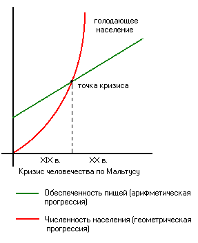 Т. Мальтус утверждал, что численность населения возрастает в геометрической прогрессии, в то время как пищевые ресурсы, необходимые для пропитания этого населения - в арифметической. Таким образом, рано или поздно, как бы медленно население ни росло, линия его роста пересечется с прямой пищевых ресурсов - арифметической прогрессией (на графике - точка Х). Когда численность населения достигнет этой точки, затормозить его рост могут только войны, нищета, болезни и пороки (необходимо отметить, что к этим способам борьбы с увеличивающимся населением он никогда не призывал, о чем довольно часто пишут трактователи его теории). В других изданиях своей книги Мальтус предлагал другие способы "торможения" роста численности населения: безбрачие, вдовство, поздние браки. Перенаселение в концепции Мальтуса - не только беда человечества, но определенное благо, которое заставляет многочисленных и ленивых от природы рабочих из-за конкуренции качественно трудиться за невысокую плату.