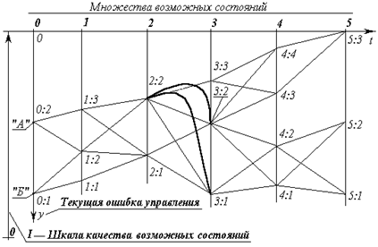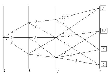 На рис. 4 показаны начальное состояние системы — «0» и множества её возможных последующих состояний — «1», «2», «3», а также возможные переходы из каждого возможного состояния в другие возможные состояния. Всё это вместе похоже на карту настольной детской игры, по которой перемещаются фишки: каждому переходу-шагу соответствует свой шаговый выигрыш, а в завершающем процесс третьем множестве — каждому из состояний системы придана его оценка, помещенная в прямоугольнике. Принципиальное отличие от игры в том, что гадание о выборе пути, употребляемое в детской игре, на основе бросания костей или вращения волчка и т.п., в реальном управлении недопустимо, поскольку это — передача целесообразного управления тем силам, которые способны управлять выпадением костей, вращением волчка и т.п., т.е. тем, для кого избранный в игре «генератор случайностей» — достаточно (по отношению к их целям) управляемое устройство.