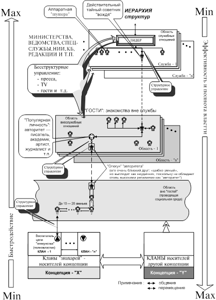 Общность в процессе самоуправления элементов информационно-алгоритмической и интеллектуальной базы[58] суперсистемы, в сочетании с господством интеллектуальных схем управления предиктор-корректор на уровне суперсистемы в целом и вложенных в неё иерархических уровнях, делают несущественной мгновенную её структурно-иерархическую упорядоченность, стирают различие между структурным и бесструктурным управлением и процесс видится как взаимная вложенность гибких (виртуальных) структур в общесуперсистемной схеме предиктор-корректор соборного интеллекта.