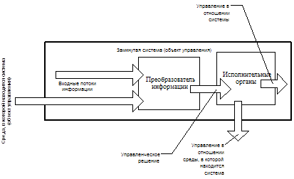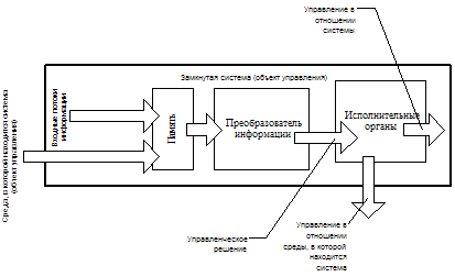 Входной поток информации (внешние и внутренние обратные связи) поступает в преобразователь, где на основе сиюминутно текущей информации вырабатывается текущее управленческое решение, которое передаётся к исполнительным органам.
