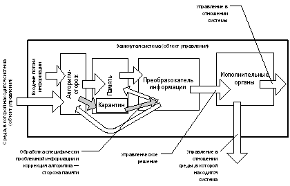 В нём всё происходит, как и во втором типе, но перед загрузкой в память входного потока информации он пропускается через алгоритм-сторож, которые выявляет недостоверную и сомнительную информацию, в том числе и попытки прямого и косвенного (опосредованного) управления извне, для того, чтобы выработка управленческого решения исходила бы только на информации, признанной достоверной. В тех случаях, когда возникают затруднения с определением качества информации, алгоритм — сторож памяти — помещает её в специализированную область памяти, показанную на рис. 3 блоком, названным «Карантин», для последующего выяснения её достоверности. Алгоритм, показанный на рис. 3, предполагает, что блок под названием «Преобразователь информации» обладает в системе наивысшими полномочиями. Потому он может перемещать информацию из «Карантина» в область нормальной «Памяти» и изменять «Алгоритм — сторож памяти» по мере накопления системой опыта взаимодействия со средой, что требует в процессе управления переоценки содержимого памяти по категориям «достоверно», «ложно», «сомнительно», «не определённо».