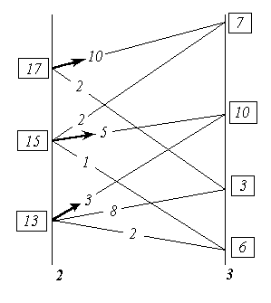В соответствии с этим на рис. 5 анализируются возможные переходы в завершающее множество состояний «3» из каждого возможного состояния в ему предшествующем множестве состояний «2», будто бы весь предшествующий путь уже пройден и осталось последним выбором оптимального шагового управления завершить весь процесс. При этом для каждого из состояний во множестве «2» определяются все полные выигрыши как сумма = «оценка перехода» + «оценка завершающего состояния». Во множестве «2» из полученных для каждого из состояний, в нём возможных полных выигрышей, определяется и запоминается максимальный полный выигрыш и соответствующий ему переход (фрагмент траектории). Максимальный полный выигрыш для каждого из состояний во множестве «2» взят в прямоугольную рамку, а соответствующий ему переход отмечен стрелкой. Таких оптимальных переходов из одного состояния в другие, которым соответствует одно и то же значение полного выигрыша, в принципе может оказаться и несколько. В этом случае все они в методе неразличимы и эквивалентны один другому в смысле построенного критерия оптимальности выбора траектории в пространстве параметров, которыми описывается система.