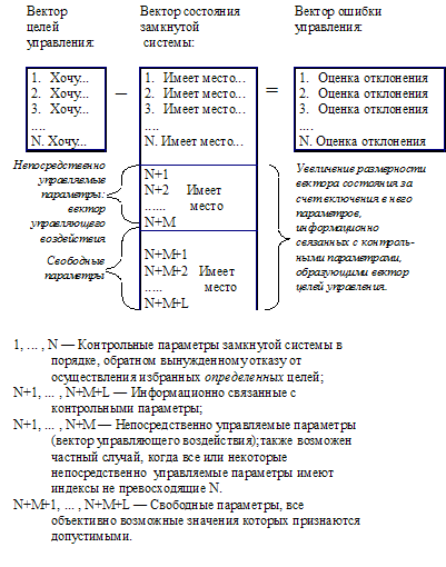 Вторая из этих двух оговорок указует кроме всего на возможность конфликта с иерархически высшим объемлющим управлением. В предельном случае конфликта, если кто-то избрал зло, упорствует в его осуществлении и исчерпал Божеское попущение, то он своими действиями вызовет прямое адресное вмешательство в течение событий Свыше. И это вмешательство опрокинет всю его деятельность на основе всех его прежних прогнозов и оценок их устойчивости — мер неопределённостей. Векторы целей управления и соответствующие им режимы управления можно разделить на два класса: балансировочные режимы — колебания в допустимых пределах относительно неизменного во времени вектора целей управления; манёвры — колебания относительно изменяющегося во времени вектора целей и переход из одного балансировочного режима (или режима манёвра) в другой, при которых параметры реального манёвра отклоняются от параметров идеального маневра в допустимых пределах. Потеря управления — выход вектора состояния (или эквивалентный ему выход вектора ошибки) из области допустимых отклонений от идеального режима (балансировочного либо маневра), иными словами, — выпадение из множества допустимых векторов ошибки. Манёвры разделяются на сильные и слабые. Их отличие друг от друга условно и определяется субъективным выбором эталонного процесса времени и единицы измерения времени. Это разделение манёвров на сильные и слабые проистекает из того, что во многих случаях моделирование слабых маневров может быть существенно упрощено за счёт пренебрежения целым рядом факторов, без потери качества управления. Всякий частный процесс может быть рассмотрен (представлен) как процесс управления или самоуправления в русле процесса объемлющего иерархически высшего управления и может быть описан в терминах перечисленных основных категорий теории управления. Это позволяет соотнести названные категории теории управления с одной из особенностей психики человека. Человеческое сознание может одновременно оперировать с семью — девятью объектами. При описании любой из жизненных проблем в терминах теории управления, общее число одновременно употребляемых категорий не превосходит девяти: 1. Вектор целей. 2. Вектор состояния. 3. Вектор ошибки управления. 4. Полная функция управления. 5. Совокупность концепций управления (целевых функций управления). 6. Вектор управляющего воздействия. 7. Структурный способ управления. 8. Бесструктурный способ управления. 9. Балансировочный режим (либо манёвр). Это означает, что информация, необходимая для постановки и решения на практике всякой из задач управления может быть доступна сознанию здравого человека в некоторых образах вся без исключения, одновременно и упорядочено, как некая мозаика на основе соотнесения образных представлений с категориями теории управления, а не бессвязно-разрозненно, подобно стекляшкам в калейдоскопе. Главное для этого — отдавать себе отчёт в том, что именно в жизни следует в процессе осознания действительности связать с каждой из категорий теории управления, чтобы не впадать в калейдоскопический идиотизм — буйно или вяло текущую махровую шизофрению. * * Эта особенность психики человека придаёт особую общественную значимость общей теории управления в практике жизни: если какие-то категории оказываются пустыми и