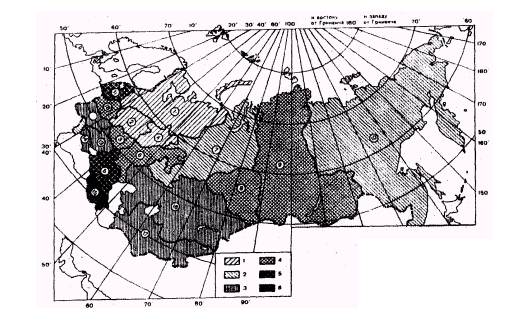 Экономические рйоны России: 1. Северо-Западный, 2. Центральный, 3. Центрально-Черноземный, 4. Волго-Вятский, 5. Северо-Кавказский, 6. Поволжский, 7. Уральский, 8. Западно-Сибирский, 9. Восточно-Сибирский, 10. Дальноевосточный, 11. Прибалтийский, 12. Юго-Западный, 13. Донецко-Приднепровский, 14. Южный, 15. Закавказский Условные обозначения. Число лиц 80 лиц и старше на 1000 лиц 60 лет и старше: 1. 85-89 чел. 2. 90-99 чел. 3. 100-104 чел. 4. 105-109 чел. 5. 109-114 чел. 6. 140 и более. Уровень долголетия в крупных регионах России