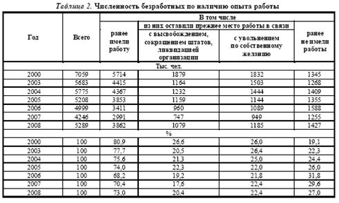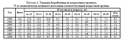Если в 2008 г. средний возраст безработных мужчин и женщин составлял 34,7 года, то в октябре 2010 г. он увеличился до 35,3 года. В группе молодых людей, чей возраст 15-19 лет, уровень безработицы вырос и составил 32,6%, в группе 20-24 лет - 13,4%. В среднем среди молодежи в возрасте 15-24 лет уровень безработицы в октябре 2010 г. составил 15,5%, в том числе среди городского населения - 14,1%, среди сельского В 2008 г. в общей численности безработных 27% составляли лица, не имеющие опыта трудовой деятельности. Доля данной группы безработных имела тенденцию к увеличению на протяжении 2000-2006 гг. (табл. 2)2. Лишь в 2007-2008 гг. наблюдается небольшое сокращение численности безработных, которые ранее не имели работы (примерно на 2% в год). В октябре 2010 г. их численность составила 1,4 млн. чел. (27,6% в общей численности безработных) и сократилась по сравнению с октябрем 2009 г. на 25 тыс. чел., или на 1,8%. Данная группа безработных формируется преимущественно из числа молодежи (по 18% - за счет молодежи до 20 лет и 2529 лет, 46% - от 20 до 24 лет). При этом каждый шестой молодой безработный - выпускник учебного заведения. Рост числа безработной молодежи и серьезное падение уровня жизни населения в последние годы привели к тому, что бедность стала устойчивым явлением не только для социально уязвимых категорий населения с ограниченной трудоспособностью, но и для вполне трудоспособной молодежи, которая в прежние времена могла полностью обеспечивать себя и оказывать финансовую поддержку своим близким. Материально благополучные ранее категории работающей молодежи стали формировать армию “новых бедных”. При этом вероятность стать безработным у молодых людей более чем в 3 раза выше, чем у взрослых. Снижение реальной заработной платы резко ухудшает условия воспроизводства рабочей силы и инициирует пагубный процесс общего упрощения труда. Низкий уровень доходов молодых работников не коррелирует с заоблачными ценами на жилье и дороговизной продуктов, лекарственных препаратов, высокими транспортными расходами. Бедность провоцирует ухудшение состояния здоровья не только молодежи, но и ее будущего потомства, что ведет к дальнейшему ухудшению качества национального человеческого потенциала. Общие беды безработных молодежь воспринимает и переживает острее, чем зрелые и опытные работники, в силу своих возрастных особенностей и неуверенного положения на рынке труда. Испытание безработицей - очень суровое испытание, тем более что неудавшаяся в самом начале жизни профессиональная карьера может отрицательно сказаться на дальнейшей судьбе человека. Ситуация, когда за годами образования и подготовки следует период безработицы, означает, с одной стороны, “невостребованность” и недостаточную эффективность полученного образования и, с другой - деквалификацию работника. Высокий уровень безработицы среди молодежи приводит к ее изоляции и отчуждению от общества, а в некоторых случаях - к усилению преступности, наркомании, насилия. Для страны это реальная угроза появления “потерянного поколения” - людей без практических навыков, опыта работы и даже желания трудиться, что может серьезно нарушить воспроизводство рабочей силы, замедлить экономический рост в будущем. А для эффективного развития отечественной экономики необходимо платежеспособное население, в том числе и молодежь. Безработица среди молод