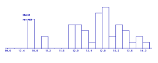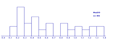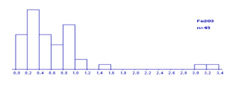 Рис По построенным гистограммам были выделены области нормальных и аномальных компонентов. Аномальные значения были исключены из исходных данных и сохранены в отдельных файлах. Расчет среднего состава каждой однородной совокупности, получение статистических характеристик Следующее изучение заключается в расчете среднего состава каждой однородной совокупности, в получении статистических характеристик, в расчете коэффициентов корреляции между компонентами (программа stxp.exe или mregp.exe). Расчет статистических характеристик Таблица. Статистические характеристики