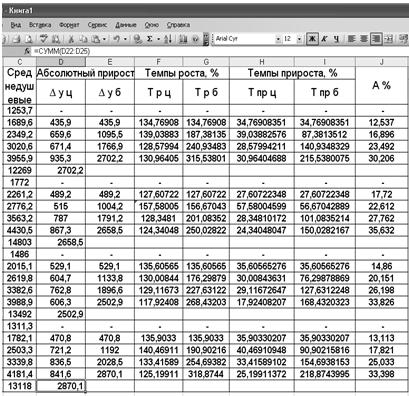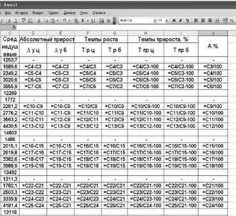 По данным таблицы 1, необходимо определить: 1. цепные и базисные: а) абсолютные приросты; б) темпы роста и прироста. 2. Абсолютное содержание 1% прироста. 3. Средние показатели ряда динамики. 2. Методика решения задачи В статистике для изучения доходов населения используется анализ рядов динамики, показывающий изменение денежных доходов в отчетном периоде по сравнению с базисным. Для характеристики интенсивности изменения денежных доходов населения во времени рассчитывается следующие макроэкономические показатели: абсолютный прирост, темп роста, темп прироста, абсолютное значение одного процентного прироста. Для обобщающей характеристики динамики исследуемого явления определяют средние показатели. (см. формулы 1 – 9, теор. часть, ст. 14). 3. Технология выполнения компьютерных расчетов Статистические расчеты динамики денежных доходов населения выполнены с применением прикладных программ обработки электронных таблиц MS Excel в среде Windows. Расположение на рабочем листе Excel исходных данных (табл. 1) представлено в табл. 2. Таблица 2 Шаблон таблицы 1