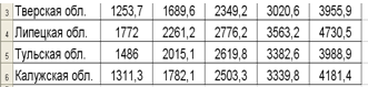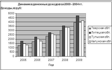 На рис. 1 представлено графическое изображение динамики денежных доходов Тверской, Липецкой, Тульской и Калужской областей за 2005 – 2009 год.