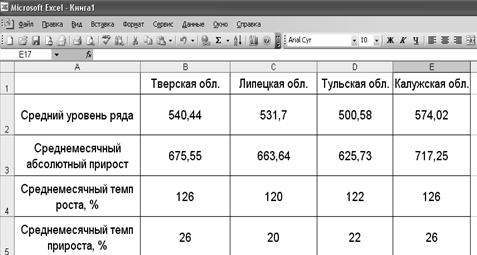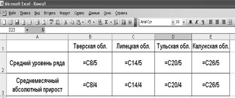 Используя данные таблицы 4 определим средние показатели ряда динамики. Расположение расчетных формул (6) – (7) (в формате Excel) представлено в таблице 5. Таблица 5