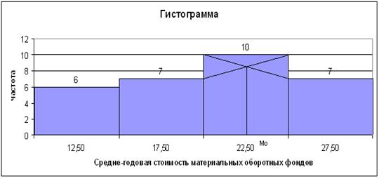 Рис. 1. Гистограмма распределения предприятий по значению среднегодовой стоимости материальных оборотных фондов Конкретное значение моды для интервального ряда рассчитывается по формуле: