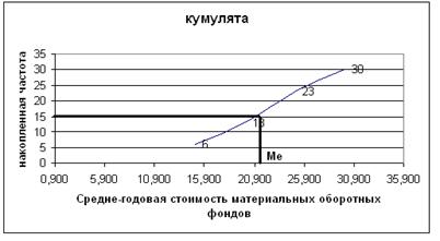 Вывод. Для рассматриваемой совокупности предприятий наиболее распространенная среднегодовая стоимость материальных оборотных фондов характеризуется средней величиной 12,5 млн руб. Медиана Ме – это значение признака, приходящееся на середину ранжированного ряда. По обе стороны от медианы находится одинаковое количество единиц совокупности. Медиану можно определить графическим методом по кумулятивной кривой (рис. 2). Кумулята строится по накопленным частотам