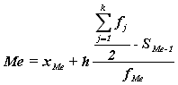 fМе – частота медианного интервала, SMе-1 – кумулятивная (накопленная) частота интервала, предшествующего медианному. Для расчета