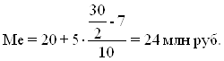 частот В демонстрационном примере медианным интервалом является интервал 20 – 25 млн. руб., так как именно в этом интервале накопленная частота Sj = 23 впервые превышает величину, равную половине численности единиц совокупности ( Расчет значения медианы по формуле (4):