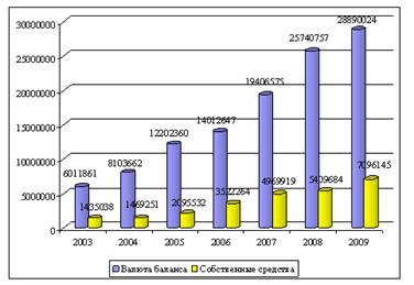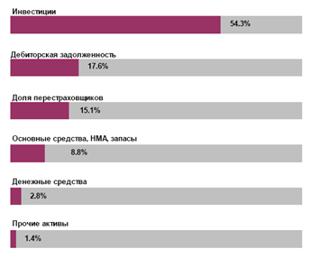 Рис. 4. Динамика величины собственных средств и валюты баланса ОАО СК "РОСНО", тыс.руб. Активы компании представлены средствами в инвестициях, денежными средствами, основными средствами, долей перестраховщиков и дебиторской задолженностью. Средства в инвестициях являются основной частью активов страховой компании, представляя собой материальное воплощение страховых резервов и капитала компании. О финансовой стабильности страховщика свидетельствует налаженная система управления рисками, консервативность в инвестиционной политике и размещении капитала, а также абсолютная прозрачность в ведении бизнеса. РОСНО, используя опыт Allianz и руководствуясь требованиями российского законодательства, проводит политику диверсификации размещения страховых резервов.