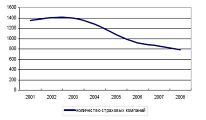 В 4-том квартале рынок покинуло 28 компаний, тогда как в первые три квартала с рынка уходило по 12-16 компаний. Их количество продолжает сокращаться с 2004 года, т.к. регулятор ведет активную деятельность по очистке страхового рынка от слабых страховых компаний. В целом, в условиях завершения отраслевой специализации доля компаний, относящихся к отрасли личного страхования, сокращается. Если в 2008 году 10% компаний от их общего числа на рынке проводили операции страхования в обеих отраслях, то к концу прошлого года «совместителей» осталось только 3%. Сейчас сориентированы на отрасль страхования жизни 8,5% страховщиков на рынке. Количество страховщиков, проводящих как только операции по страхованию жизни, так и по страхованию жизни и личному страхованию одновременно, за год увеличилось в практически одинаковой пропорции (порядка 30% по сравнению с 2008 годом). Динамика числа страховых компаний, зарегистрированных в Едином государственном реестре субъектов страхового дела, представлена на следующем графике (см. рис. 6).
