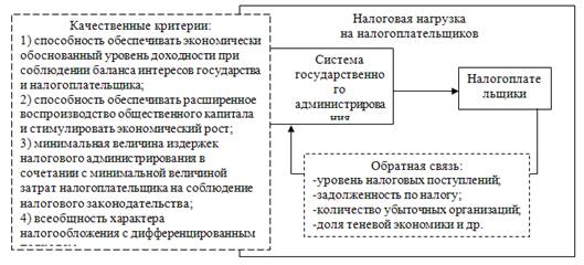 Рис. 8. Структурная схема функционирования эффективной системы налогообложения прибыли В указанной модели значения показателя налоговой нагрузки являются результатом функционирования системы налогообложения прибыли. Для того, чтобы модель устойчиво функционировала необходимо учитывать как система государственного администрирования налогообложения прибыли воздействует на регулируемый объект (налогоплательщиков), то есть должна существовать обратная связь. В рамках принятой модели обратная связь может характеризоваться такими показателями, как уровень налоговых поступлений, задолженность по налогу; количество убыточных организаций; доля теневой экономики и др. Для оценки эффективности и соответствия современным требованиям данной системы необходимо задействовать ряд качественных критериев. В качестве количественной характеристики эффективной системы налогообложения прибыли ОАО СК "РОСНО предложена методика оценки бюджетного потенциала налога на прибыль, позволяющая более обоснованно подходить к определению контрольных показателей по мобилизации налога на прибыль в бюджеты, основанная на покомпонентном прогнозировании налоговой базы с применением соответствующих ставок составляющих налоговой базы с учетом фискального, производственно-стимулирующего, контрольного потенциалов и корректировкой на коэффициент собираемости. Суть предлагаемой методики заключается в следующем. Потенциальная способность региона генерировать бюджетные доходы от налога на прибыль, определяется экономической структурой региона и его обеспеченностью налогооблагаемыми ресурсами - налоговой базой, то есть суммой налогооблагаемой прибыли, полученной всеми зарегистрированными в регионе организациями. При реализации данного подхода на макро уровне прогнозируется величина налогооблагаемой прибыли посредством умножения средней соответствующего показателя за три предыдущих последовательных налоговых периода на индекс роста. На микро уровне - величина налогооблагаемой прибыли прогнозируется посредством умножения на индекса роста. В качестве индекса роста может быть выбран прогнозируемый темп роста номинального валового внутреннего продукта (ВВП) или валового регионального продукта (ВРП) на макро уровне, а также индекс инфляции (если предполагается, что показатель растет пропорционально росту цен) - на микро уровне. Прогнозируемое значение является налоговой базой для расчета налога по основной ставке как в федеральный, так в территориальный бюджеты, поскольку еще не исключены дополнительные региональные льготы. где, НБпрогн. - прогнозируемое значение налоговой базы для расчета налога на прибыль в федеральный (территориальный) бюджет; НБn-3, НБn-2, НБn-1 - фактическое значение налоговой базы за три предыдущих последовательных налоговых периода (n - налоговый период, на который рассчитывается прогноз); ВВП (ВРП)прогн. - прогнозная величина ВВП (ВРП); ВВП (ВРП)факт.пред. - величина ВВП (ВРП) за предыдущий налоговый период. На микро уровне прогнозируемое значение налоговой базы будет равно: Исходя из полученных результатов, о прогнозируемой величине налоговой базы налога на прибыль организаций можно рассчитать фискальный потенциал налога на прибыль. В силу возможности применения региональных льгот, обязательства по уп