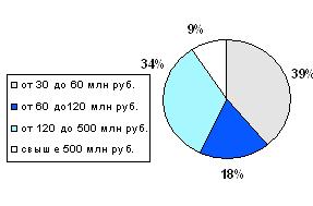 Распределение страховщиков по группам в зависимости от величины уставного капитала за прошедший год практически не изменилось. По итогам 2008 года доля страховых организаций с уставным капиталом от 30 до 60 млн. рублей составила 39%. Доля страховых организаций с уставным капиталом от 120 до 500 млн. рублей - 34%. Диаграмма 10 - Распределение страховых организаций в зависимости от размера уставного капитала 2008 г.