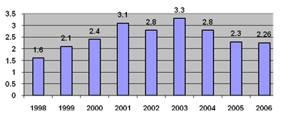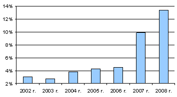 Рост прямого участия иностранных инвесторов в уставных капиталах российских страховщиков вызван, прежде всего, покупкой страховой организации «Оранта» голландской компанией (сумма уставного капитала – 1 млрд. руб.); переходе 50% уставного капитала ОСАО «Россия» в собственность кипрских организаций (на сумму 1 млрд. руб.); а также приобретением шведскими инвесторами СОАО «Регион» (уставный капитал – 0,3 млрд. руб.) В общей сложности в форме прямых инвестиций в уставные капиталы российских страховщиков в течение 2008 года было направлено 3,4 млрд. руб., при этом в ряде компаний произошло сокращение доли прямых иностранных инвестиций на общую сумму 2,3 млрд. руб. ООО «Страховая компания «Согласие» полностью перешло из собственности кипрской организации в собственность российского физического лица. Что касается увеличения доли косвенного участия иностранных инвесторов в уставных капиталах страховых организаций, то оно произошло, в первую очередь, за счет перехода собственности на ЗАО «Страховая группа «УралСиб» (уставный капитал 2,2 млрд. руб.), 87% акций ЗАО СКПО «УралСиб» (уставный капитал 1,1 млрд. руб.) и ЗАО «КапиталЪ перестрахование» (уставный капитал 0,9 млрд. руб.) к организациям, являющимся дочерними по отношению к иностранным инвесторам. Диаграмма 11 - Доля иностранных участников в уставном капитале страховых организаций, 2002-2008 гг.