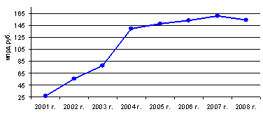 На протяжении 2004 - 2007 годов на российском страховом рынке происходили процессы нормативно предписанного увеличения размеров уставного капитала страховщиков. Первый этап в 2004 году привел к двукратному увеличению совокупного уставного капитала. Второй и третий этапы, завершившиеся 30 июня 2006 года и 30 июня 2007 года, также вызвали некоторый рост совокупной капитализации страховщиков. 2008 год стал первым годом, в течение которого законом не было предписано обязательное увеличение капитала, в результате чего на совокупную капитализацию страхового рынка оказывали влияние два разнонаправленных процесса: добровольное увеличение уставного капитала некоторыми страховщиками, а также уход некоторых компаний с рынка. В результате, эффект от второго процесса оказался сильнее и, несмотря на то, что 106 страховщиков увеличили в течение 2008 года свой уставный капитал на общую сумму 13 млрд. руб., отзыв лицензий у ряда крупных компаний, таких как «Колорадо» (3,2 млрд. руб. уставного капитала), «ТНП – Гарант» (1,4 млрд. руб.), «Профи Ре» (0,8 млрд. руб.), «Рекон» (0,7 млрд. руб.) и другие привел к тому, что совокупный уставной капитал российских страховщиков в 2008 году сократился на 4% и составил 153,8 млрд. руб. Диаграмма 9 - Динамика совокупного уставного капитала страховых организаций, 2001-2008 гг.