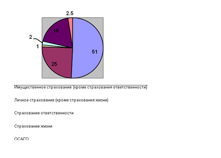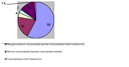 График 1. Динамика доли страхования в ВВП, %. За 2008 год структура страховых премий и страховых выплат (без ОМС) существенно не изменилась. Доля имущественного страхования составила 58%. Не изменилась, либо незначительно изменилась доля таких видов страхования как личное (20%), ОСАГО (14%), страхование ответственности (4%), обязательное личное страхование (кроме ОМС) (1,4%). Сборы по страхованию жизни, оставаясь низкими в номинальном выражении, занимали всего 3% в общей структуре рынка . Диаграмма 1 Структура премий (без ОМС) по видам страхования,2008 г.