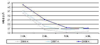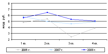 Таким образом, для лидеров рынка характерен рост опережающими темпами по сравнению со страховщиками среднего уровня, в то время, как небольшие компании не увеличивают объемы деятельности или вообще уходят с рынка. Рост уровня концентрации вызван также волной слияний и поглощений, наблюдаемой в последние годы на страховом рынке. В связи с вступлением России в ВТО и открытием российского страхового рынка для иностранных страховщиков отмеченная выше тенденция будет только усиливаться. Последние несколько лет идет активная борьба со «схемами» в страховании жизни, в результате чего часть бывших лидеров по этому виду потеряла лицензии. Компании, в планы которых входило продолжение работы на рынке, были вынуждены существенно свернуть налогооптимизирующие операции, либо вообще отказаться от псевдостраховой деятельности. На начало 2007 года доля страхования жизни в совокупном страховом портфеле российских страховщиков составляла лишь 3 %, тогда как во всех развитых странах на страхование жизни часто приходится основная часть рынка страхования (от 40 % до 80 % от общей страховой премии). Следует отметить, что в секторе страхования жизни в 3 квартале 2008 года впервые наблюдался рост, вызванный оживлением спроса. Однако затем в 4 квартале отмечено ощутимое снижение сборов на 10%. Сборы по личному страхованию, для которого характерна высокая сезонность (большая часть страховых премий, собираемых по видам страхования, входящим в данную группу, традиционно приходится на 1 квартал), показали заметное снижение темпов роста уже начиная с 3 квартала 2008 года. Так, сезонный спад 3 квартала, характерный для сборов по личному страхованию и составлявший в 2007 году - 20%, в 2008 году достиг – 34%, а небольшое оживление в данном секторе, присущее 4 кварталу и составлявшее в 2007 г. 12% прироста, сменилось спадом в – 3%. Диаграмма 3 - Динамика ежеквартальных премий по страхованию жизни, 2006 – 2008 гг.
