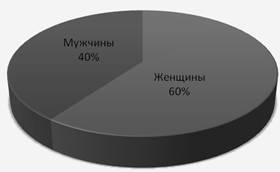 На приведенной диаграмме видно, что 54% пациентов имеют возраст старше 50 лет. Доля мужчин и женщин, пролеченных в дневном стационаре, составляет 40% и 60% соответственно.