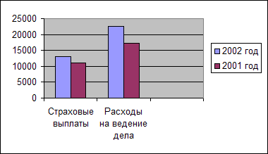 Диаграмма №1 Обозначения: 1 – страхование сложных технических рисков 2 – массовые виды страхования 3 – страхование жизни Из диаграммы №1 видно, что портфель по добровольным видам сложился следующим образом: - по страхованию жизни – 13%; - по массовым видам страхования – 75%; - по страхованию сложных технических рисков – 12%. Делаем вывод о несбалансированности портфеля договоров по добровольным видам страхования. Проведем соответствующий анализ за 2002 и 2001 годы. Представим состав расходов страховой организации за 2002 и 2001 годы в диаграмме №2.