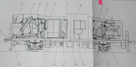 1- рама; 2- сварочное оборудование; 3- устройство для перемещения сварочного оборудования; 4- капот подъемный; 5- система охлаждения сварочной машины; 6- капот передний; 7- гидравлическое оборудование; 8- кабина; 9- капот задний; 10- силовая установка; 11- песочница; 12- блок колесно-моторный; 13- рессорное подвешивание; 14- передача рычажная тормоза; 15- тормоз ручной; 16- электрооборудование; 17- компрессор; 18- пневмотормозное оборудование; 19- устройство для подтягивания рельсов Рисунок 1.3 - Общий вид путевой рельсосварочной самоходной машины ПРСМ-4 В таблице 1.3 приведены технические характеристики путевой рельсосварочной самоходной машины ПРСМ-4. Таблица 1.3 – Техническая характеристика машины ПРСМ-4