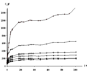 1 - композиция с объемным содержанием пигмента 0,091; 2 - композиция с объемным содержанием пигмента 0,136; 3 - композиция с объемным содержанием пигмента 0,182; 4 - композиция с объемным содержанием пигмента 0,227; 5 - композиция с объемным содержанием пигмента 0,272; 6 - композиция с объемным содержанием пигмента 0,318; 7 - композиция с объемным содержанием пигмента 0,363. Рисунок 5.1 – Изменение значений электрической емкости системы окрашенный металл – электролит.