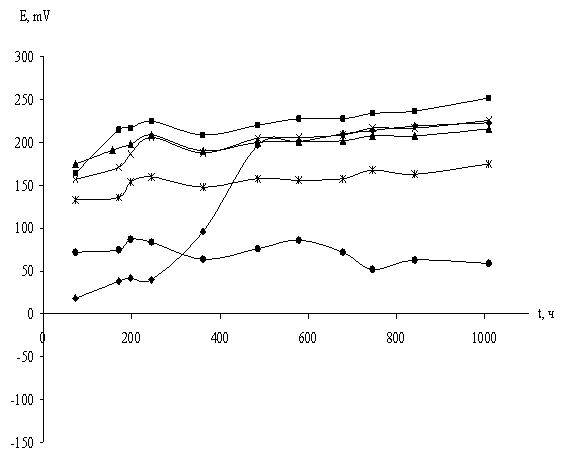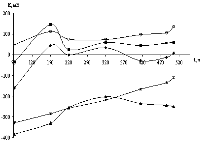 1 – состав 5 2 – состав 6 3 – состав 7 4 – состав 8 5 – состав 9 Рисунок 5.7 – Изменение значений коррозионного потенциала системы электролит – окрашенный металл Таблица 5.8 – Результаты комплексной оценки состояния образцов стали с пигментированными покрытиями, содержащими манганат (IV) силикат кальция