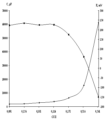 Для исследования было приготовлено 7 композиций, объемное содержание пигментов которых изменялось от 0,091 до 0,363. Образцы наносили на подготовленные по методике, описанной в разделе 3, пластины из стали 0,8 КП ракелем тремя слоями. Средняя толщина покрытий составляла 30 мкм. Об оптимальном соотношении пигмент / пленкообразователь судили по противокоррозионной эффективности покрытия, в качестве исследуемых характеристик были использованы изолирующие и защитные свойства покрытий, которые количественно описывают величины электрической емкости (С) и коррозионного потенциала стали под покрытием (Е) соответственно, а также результатами комплексной оценки состояния покрытий после испытаний. Время контакта электролита с покрытием 1000 часов. На рисунке 5.1 представлены кривые изменения значений электрической емкости во времени для покрытий на основе соосажденного манганат (IV) силиката кальция 1:0,1. Для образцов с наполнениями от 0,091 до 0,227 наблюдается относительно близкие емкости, значения которых ниже 3 нФ и практически не изменяется в процессе испытаний, что свидетельствует о высоких барьерных свойствах этих образцов. Для наполнений от 0,272 до 0,363 характерны высокие значения электрической емкости (выше 5 пФ), что свидетельствуют о высокой гидрофильности покрытий и возможном нарушении их сплошности, развитии подпленочной коррозии. На рисунке 5.2 представлены хронопотенциометрические кривые покрытий на основе соосажденного манганат (IV) силиката кальция. Кривые коррозионного потенциала с наполнением 0,091 – 0,318 находятся в области положительных значений, что свидетельствует о торможении коррозионных процессов. Покрытию с наполнением 0,318 соответствует процесс зарождения очагов коррозии, о чем свидетельствует спад его потенциала. Покрытия с более высоким уровнем наполнения будут сопровождаться потерей защитных свойств, что в свою очередь подтверждает седьмой образец с наполнением 0,363, имеющий потенциал минус 150 мВ. Данное наполнение характеризуется увеличением объемного содержания пигмента выше определенного уровня, что привело вследствие недостатка пленкообразователя к структурным изменениям вплоть до нарушения сплошности. На рисунке 5.3 представлена зависимость коррозионного потенциала и электрохимической емкости системы сталь – покрытие – электролит от содержания соосажденного манганат(IV)силиката кальция. Время контакта электролита с покрытием 1000 часов.
