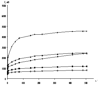 1 – состав 5 2 – состав 6 3 – состав 7 4 – состав 8 5 – состав 9 Рисунок 5.5 – Изменение значений электрической емкости системы электролит – окрашенный металл