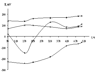 1 – состав 1 2 – состав 2 3 – состав 3 4 – состав 4 Рисунок 5.6 - Изменение значений коррозионного потенциала системы электролит – окрашенный металл