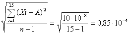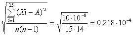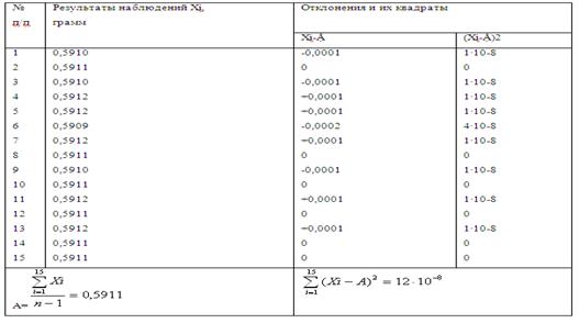 Среднеквадратическое отклонение результата наблюдения определяется по формуле (Г.1): д(А)= Неравенство 3d(А) £ (Xi – A) несправедливо для всех i от 1 до 15, можно сделать вывод, что грубых ошибок среди результатов наблюдений нет. Оценка среднеквадратического отклонения результата измерения: S(A)= Доверительные границы случайной погрешности определяем: о=t∙S(A)=2,16∙0,239∙10-4=0,516∙10-4 г Доверительные границы неисключенной систематической погрешности: