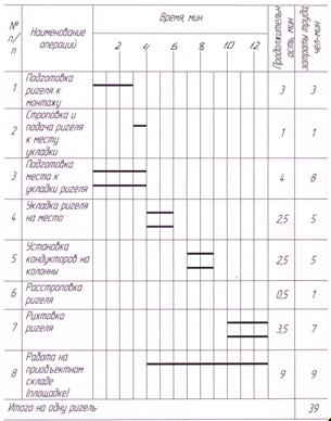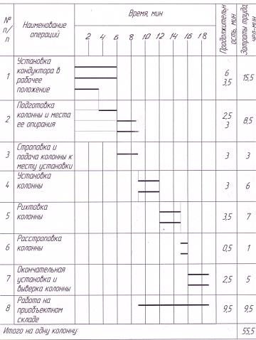 3.12 Указания по технике безопасности 1. Монтаж конструкций здания следует начинать, как правило, с пространственно-устойчивой части 2. Монтаж конструкций каждого вышележащего этажа здания следует производить после закрепления всех установленных монтажных элементов по проекту и достижения бетоном стыков несущих конструкций проектной прочности. 3. На участке, где ведутся монтажные работы, не допускается выполнение других работ и нахождения посторонних лиц. 4. В процессе монтажа конструкций здания или сооружения монтажники должны находиться на ранее установленных и надежно закрепленных конструкциях или средствах подмащивания. 5. Для перехода монтажников с одной конструкции на другую следует применять лестницы, пешеходные мостики и трапы, имеющие ограждения. 6. Расчалки для временного закрепления монтируемых элементов должны быть прикреплены к надежным опорам. 7. Запрещается переход монтажников по установленным конструкциям и их элементам, на которых возможно обеспечить требуемую ширину прохода при установленных ограждениях без применения специальных предохранительных приспособлений (натянутого вдоль фермы или ригеля каната для закрепления карабина предохранительного пояса). 8. Элементы монтируемых конструкций или оборудования во время перемещения должны удерживаться от раскачивания и вращения гибкими оттяжками. 9. Строповку монтируемых элементов следует производить в местах, указанных в рабочих чертежах, и обеспечить их подъем и подачу к месту установки в положении, близком к проектному 10. Монтируемые элементы следует поднимать плавно, без рывков, раскачивания и вращения. 11. Во время перерывов в работе не допускается оставлять поднятые элементы конструкций и оборудования на весу. 12. Установленные в проектное положение элементы конструкций или оборудования должны быть закреплены так, чтобы обеспечивалась их устойчивость и геометрическая неизменяемость. 13. Запрещается выполнять монтажные работы на высоте в открытых местах при скорости ветра 15 м/с и более, при гололеде, грозе или тумане, исключающие видимость в пределах фронта работ. 3.13 График трудовых процессов На монтаж колонн: