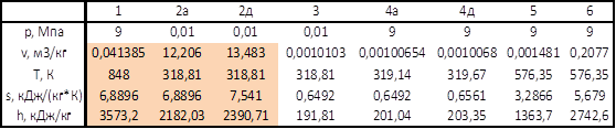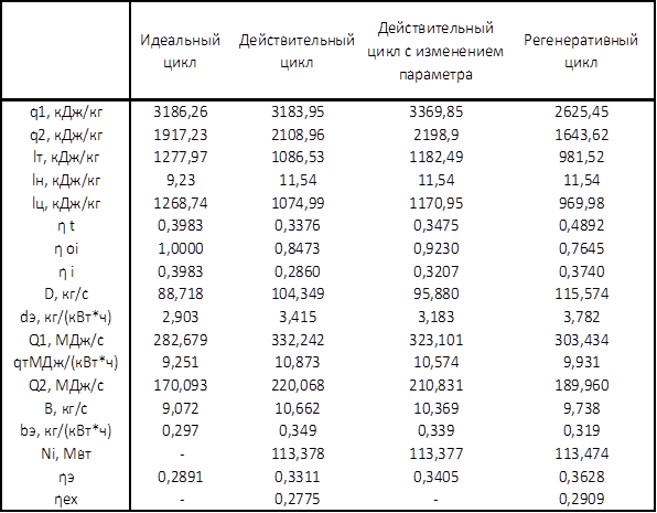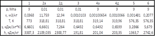 Идеальный цикл ПТУ q1=h1-h4a=3387,3-201,04=3186,26кДж/кг q2=h2a-h3=2109,035-191,81=1917,23кДж/кг lТ= h1-h2a=3387,3-2109,035=1277,97 кДж/кг lH= h4a-h3=201,04-191,81=9,23 кДж/кг lц=lT-lH=1277,97-9,23=1268,74 кДж/кг ηt=(q1-q2)/q1=(3186,26-1917,23)/3186,26=0,3983 D=N0/(h1-h2a)=Nэ/ (h1-h2a)/ηМ/ ηГ=110/1277,97/0,98/0,99=88,718 кг/с dЭ=3600*D/NЭ=3600*88,718/110=2,903 кг/(кВт*ч) Q1=D*q1=88,718*3186,26=282,679 МВт qT=3600*Q1/NЭ=3600*282,679/110=9,251 МДж/(кВт*ч) B=Q1/( ηка*QHP)=282,679/(0,82*38)=9,072 кг/с bЭ=3600*B/ NЭ=3600*9,072/110=0,297 кг/(кВт*ч) Q2=q2*D=1917,23*88,718=170,093 МВт ηoi=lцд/lца=1 ηЭ=NЭ/Q1=110/282,679=0,3891 ηi=(q1-q2)/q1=(3186,26-1917,23)/3186,26=0,3983 Действительный цикл ПТУ q1=h1-h4д=3387,3-203,35=3183,95 кДж/кг q2=h2д-h3=2300,77-191,81= 2108,96кДж/кг lТ= (h1-h2а)* ηoiT=(3387,3-2109,035)*0,85=1086,53 кДж/кг lH= (h4а-h3)/ ηoiН=(201,04-191,81)/0,8=11,54 кДж/кг lц=lT-lH=1086,53-11,54=1074,99 кДж/кг ηt=(q1-q2)/q1=(3183,95-2108,96)/3183,95=0,3376 D=Ni/(h1-h2д)=Nэ/ (h1-h2д)/ηМ/ ηГ=110/1086,53/0,98/0,99=104,349 кг/с dЭ=3600*D/NЭ=3600*104,349/110=3,415 кг/(кВт*ч) Q1=D*q1=104,349*3183,95=332,242 МВт qT=3600*Q1/NЭ=3600*332,242/110=10,873 МДж/(кВт*ч) B=Q1/( ηка*QHP)=332,242/(0,82*38)=10,662 кг/с bЭ=3600*B/ NЭ=3600*10,662/110=0,349 кг/(кВт*ч) Q2=q2*D=2108,96*104,349=220,068 МВт ηoi=lцд/lца=1074,99/1268,74=0,8473 ηЭ=NЭ/Q1=110/332,242=0,3311 ηi=(q1-q2)/q1* ηoi =(3183,95-2108,96)/3183,95*0,8473=0,2860 Ni=D*(h1-h2д)=104,349*1086,53=113,378 МВт Расчёт параметров точек цикла ПТУ с измененным параметром t1=500*1,15=575 ˚C=848K 1 – перегретый пар ti=570 ˚C v(ti)=0,04109 м3/кг ti+1=580 ˚C v(ti+1)= 0,04168м3/кг v1(t=575)=0,041385 м3/кг ti=570 ˚C s(ti)=6,8752 кДж/(кг*К) ti+1=580 ˚C s(ti+1)= 6,9040 кДж/(кг*К) s1(t=575)=6,8896 кДж/(кг*К) ti=570 ˚C h(ti)=3561,0 кДж/кг ti+1=580 ˚C h(ti+1)= 3585,4 кДж/кг h1(t=575)=3573,2 кДж/(кг*К) 2а – влажный насыщенный пар t2=45,81˚C v’2а=0,0010103 м3/кг v’’2а=14,671 м3/кг h’2а=191,81 кДж/кг h’’2а=2583,9 кДж/кг s’2а=0,6492 кДж/(кг*К) s’’2а=8,1489 кДж/(кг*К) x2a=(6,8896-0,6492)/(8,1489-0,6492)=0,832 v2a=v’2a*(1-x2a)+v’’2a*x2a v2a=12,206 м3/кг h2a= h’2a*(1-x2a)+h’’2a*x2a h2a=2182,03 кДж/кг 2д – влажный насыщенный пар ηoiT=(h1-h’2д)/(h1-h2a) h2д=h1- ηoiT*(h1-h2a) h2д=2390,71 кДж/кг x2д=(h2д-h’2д)/(h’’2д-h’2д) x2д=0,919 v2д= 13,483 м3/кг s2д=7,541 кДж/(кг*К) По рассчитанным данным составляется таблица 2