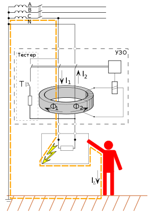 Рис. 4 - Защитные средства: а - диэлектрические перчатки; б - диэлектрические боты и галоши; в - диэлектрический резиновый коврик или дорожка; г - изолирующая подставка К защитным средствам относятся такие, изоляция которых надежно выдерживает рабочее напряжение электроустановок до 500 В и при помощи которых можно касаться токоведущих частей, находящихся под напряжением. Защитные средства должны иметь свой номер, своевременно проходить проверки и испытания, выдаваться для пользования под расписку и применяться в строгом соответствии с их назначением. 9. Защитное отключениеДвухполюсное УЗО с номинальным током 100 А. Устройство защитного отключения (сокр. УЗО; более точное название: устройство защитного отключения, управляемое дифференциальным (остаточным) током, сокр. УЗО−Д) - механический коммутационный аппарат или совокупность элементов, которые при достижении (превышении) дифференциальным током заданного значения при определённых условиях эксплуатации должны вызвать размыкание контактов. Может состоять из различных отдельных элементов, предназначенных для обнаружения, измерения (сравнения с заданной величиной) дифференциального тока и замыкания и размыкания электрической цепи (разъединителя). Основная задача УЗО - защита человека от поражения электрическим током и от возникновения пожара, вызванного утечкой тока через изношенную изоляцию проводов и некачественные соединения. Широкое применение также получили комбинированные устройства, совмещающие в себе УЗО и устройство защиты от сверхтока, такие устройства называются УЗО−Д со встроенной защитой от сверхтоков, либо просто диффавтомат. Часто диффавтоматы снабжаются специальной индикацией, позволяющей определить, по какой причине произошло срабатывание (от сверхтока или от дифференциального тока). НазначениеУЗО предназначены для · Защиты человека от поражения электрическим током при косвенном прикосновении (прикосновение человека к открытым проводящим нетоковедущим частям электроустановки, оказавшимся под напряжением в случае повреждения изоляции), а также при непосредственном прикосновении (прикосновение человека к токоведущим частям электроустановки, находящимся под напряжением). Данную функцию обеспечивают УЗО соответствующей чувствительности (ток отсечки не более 30 мА). · Предотвращения возгораний при возникновении токов утечки на корпус или на землю. Цели и принцип работы |