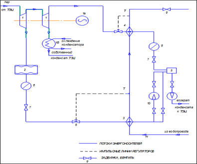 Рис.1- Схема использования тепла конденсата в подогревателе горячего водоснабжения 1-ой ступени 1-паровая турбина с промышленным и отопительным отборами пара; 1а- электрогенератор; 1б- конденсатор пара; 2-технологический агрегат 3- подогреватель горячего водоснабжения I-ая ступень; 4- подогреватель горячего водоснабжения II-ая ступень; 5- бак сбора конденсата; 6- конденсатоотводчик; 7- обратный клапан; 8- регулятор расхода греющего теплоносителя; 9- потребитель горячего водоснабжения; 10- конденсатный насос. Утилизация тепловых вторичных энергоресурсов На данном производстве наиболее существенным потенциалом тепловых ВЭР располагает поток конденсата, образовавшегося из пара технологического потребителя (Qтех.) и собранным в БСК По варианту задания пар имеет давление насыщения Рнас=500 кПа, и температуру насыщения Тнас. = 152С Оценка параметров теплоносителей в схеме использования тепла конденсата, образовавшегося в технологическом агрегате. Нормируемыми являются температуры воды из холодного водопровода Тхв=+5°С и температура горячей воды у потребителя Тгв=+65°С. Общий подогрев воды в 60°С распределим между 1-й и 2-й ступенью . Нагрев в 1-й ступени примем до Тгв1=30-35°С; нагрев во 2-й ступени на ∆Тгв2=30-35°С Количество конденсата, поступающего от технологического агрегата: G к = kвоз*Dп = 6,63кг/с. Здесь коэффициент возврата конденсата kвоз принят равным 0,9. Наибольшее количества тепла, переданного конденсатом холодной воде в 1-й ступени теплообменника горячего водоснабжения: Qгв1 мах = Gк * Ср* ∆Тк=4,19 *6,63* (152 -20)= 3666,0 кВт. здесь Ср -уд. теплоемкость конденсата, равная 4,19 кДж/(кг* К) ∆Тк - охлаждение конденсата от температуры насыщения до температуры воды на выходе из первой ступени подогревателя горячего водоснабжения. Расход воды, поступающей из водопровода в 1-ую ступень подогрева: G в = η*Qгв1 мах / (Ср *∆Тгв) =0,85 *3666,0/ (4,19 *20) =37,18кг/с где η -коэф., учитывающий тепловые потери водоподогревателя, равный 0,85 Тепловая мощность водоподогревателя 2-ой ступени: Qгв2 мах = Gв * Ср* ∆Тгв2 =37,18* 4,19 *20 =3116,09 кВт. Расход пара, поступающего из отопительного отбора в водоподогреватель 2-ой ступени: Dот = Qгв2 /(h" - h' )* η =3116,09/ (2748- 640) *0,9 =1,33кг/с. или 4,79 т/ч. где h" –уд. энутальпия насыщенного пара отбора при давлении : 500 кПа h' -уд. энтальпия конденсата пара при этом же давлении . η- коэф., учитывающий тепловые потери водоподогревателя, равный 0,9. Часовой расход условного топлива, сэкономленный за счет использования тепла конденсата в 1-ой ступени подогрева пропорционален его тепловой мощности: Вчас=Qгв1 мах /(Qрн* ηка)= 3666,0/ (29330*0,85) =0,147 кг/с или 0,529374452 т/ч. где Qрн -низшая теплота сгорания условного топлива, равная 29330 кДж/кг, ηка- коэф. полезного действия замещаемого котельного агрегата, принят 0,85 Годовая экономия условного топлива за счет утилизации тепла конденсата пропорциональна продолжительности работы подогревателя горячего водоснабжения 1-ой ступени в течение года: Вгод= Вчас τгод/К=0,529374452* 8760 / 2,6 =1783,584692 т/год Таким образом, за счет утилизации тепла конденсата (ВЭР) удалось сэкономить: 1784 т/год условного топлива, что составляет 14,37 % от затрат топлива на выпуск основной продукции. где К- коэффициент часовой неравномерности горячего водо -снабжения нормируется для жилых зданий по [4]; и принят К = 2,6 ;