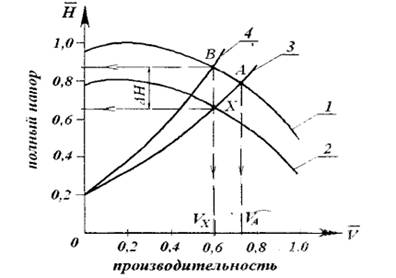 Рис.4-безразмерная характеристика центробежного насоса 1- характеристика насоса при номинальном режиме с числом оборотов nном; 2- характеристика насоса при числе оборотов nx; 3- характеристика сети конденсатора; 4- характеристика сети с дополнительным дросселированием: - А– номинальный режим работы насоса в сети ; -В- режим работы насоса в сети с дросселем; -Х- режим работы насоса при числе оборотов nx Расчет регулирования производительности конденсатного насоса Производительность насоса в номинальном режиме равна расходу конденсата G к = kвоз*Dп =6,63 кг/с. Здесь коэффициент возврата конденсата kвоз принят равным 0,9. Объемная подача Vном=3600 ( G к /ρ)= 23,86195446 м3/час. По объемной подаче выбираем из таблицы насос марки 10 КСД-5х3 с номинальным числом оборотов 1450 потребляемой мощностью привода N=66 кВт. В соответствии с суточным графиком 3-х сменной работы диапазон изменения объемной подачи равен диапазону массовой: ΔG= ΔV= (1÷0,5) G ном; (Vном) Сниженная подача Vх=0,5*23,86195446=11,93097723 м3/час=0,00331416 м3/с Число оборотов при сниженной подаче: nx=nном (Vх /Vном )= 1450*0,5 =725 Мощность привода в режиме сниженной производительности: Nx =Nном * (nном / n x )3 =66* (725/1450)3=8,25кВт. При регулировании подачи с помощью вентиля (дросселирование потока) потеря напора на преодоление гидравлического сопротивления составит: Δ Н= ζ*w 2/2g =8 *(3)2/2*9,8= 3,673469388 Н/м2 [Па], здесь приняты: скорость потока w = 3 м/с. коэффициент местного сопротивления ζ=8. Дополнительная затрата мощности на преодоление гидросопротивления вентиля: ΔNдр=Vх*ΔН*g*ρ/ή=0,00331416*3,673469388*9,8*1000*0,8=0,095447818 кВт. здесь ή - коэф. полезного действия насоса, обычно равен 0,77-0,88. Таким образом, применяя частотное регулирование скоростью вращения привода насоса, можно избежать дополнительных затрат мощности. Экономия составит : ΔNдр/ Nx= 0,095447818/8,25= 1,156943247 % Вывод На примере производства древесно-стружечной плиты мы убедились, что возможно существенное сокращение потерь: на стадиях генерации, транспорте и использования эл. энергии. |
