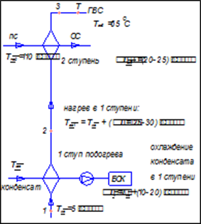 Рис.2- Схема распределения подогрева по ступеням ГВС Сокращение тепловых потерь по трассе конденсат провода тепловая электрическая энергия топливо Для снижения потерь при транспорте теплоносителей трубопровод покрыт теплоизоляцией из материалов, имеющих повышенное термическое сопротивление слоя (асбоцементные изделия, вата, пенобетонные изделия и д.р.). Величина тепловых потерь нормируется согласно СНиП 2.04.07.86. Тепловые сети.[3] В зависимости от диаметра трубопровода нормируется величина тепловых потерь величиной % от тепловой мощности передаваемой по трубопроводу. Можно снизить потери тепла на теплотрассе путем замены традиционных теплоизоляционных материалов на современные пенополиуретановые, ныне широко рекомендуемые, и отличающиеся в 1,5 раза величиной термического сопротивления. Расчет потерь Определение диаметра d трубопровода при скорости конденсата w= (1-3) м/с. d =(4* Gв *V/(w*3,14))0,5 =(4*37,18* 0,37 / (3*3,14))0,5 =0,125657302 м. где Gв – расход теплоносителя (кг/с); V –уд. объем конденсата (насыщенной жидкости), равен: 0,37 м3/кг w–скорость конденсата м/с, примем 3 м/с.Из таблицы для условного диаметра 200 мм норма тепловых потерь для традиционных материалов составляет 1,08% от передаваемой тепловой мощности, при использовании пенополиуретановой теплоизоляции тепловые потери могут быть снижены в 1,5 раза, т.е. до 0,72% или на 0,36% С пенополиуретановой теплоизоляцией конденсат провода снижение тепловых потерь составит: ΔQпот= *Qгв1мах=0,36 *Qгв1мах=0,36 *3666=13,2 кВт. При снижении теплопотерь годовая экономия условного топлива за период подачи пара на технологию244 суток составит: В= (ΔQпот/29,3)*3,6*24*244= 9,5 т/год что составляет примерно 0,05640851 % от затрат топлива на выпуск основной продукции. Расход эл.энергии на технологический процесс: пропорционален выпуску продукции П, уд. нормам расхода электроэнергии э, периоду времени: Эсут = э*Псут2,04*25=51 кВт/ч. Эгод =Э*lг=51*244=12444 кВт/ч. Регулирование производительности конденсатного насоса Подача пара к технологическому агрегату в течении суток изменяется в соответствии с продолжительности и числом рабочих смен. На графиках расходы приведены в относительных величинах от максимума (D¯= D/Dmax); Переменный режим работы конденсатного насоса можно регулировать двумя методами: - регулирующей запорной арматурой (вентилем, задвижкой, и т.п.) - изменением числа оборотов привода насоса (частотой вращения электродвигателя).
