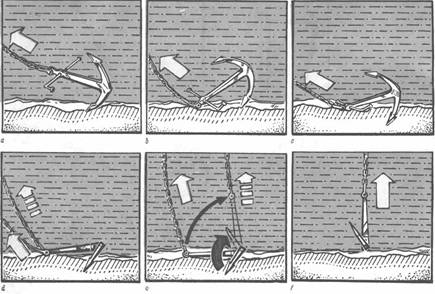 Рисунок 1 - Постановка на якорь и снятие с якоря: а - якорь скользит по грунту; b - якорь зацепляется; с - якорь зарывается; d - якорная цепь натягивается; е - якорная цепь вырывает якорь из грунта; f - якорь поднимается При отдаче якорь падает на дно (рис. 1, а) и буксируется движущимся судном (рис. b). При этом за счет действия штока (шток-анкер) или за счет своей формы (якорь патентованной системы) якорь поворачивается лапами к морскому дну. Если он буксируется дальше, то его лапы зарываются в землю и якорь «зацепляется» (рис. с). При подъеме якоря сначала выбирают якорную цепь (рис. d), которая постепенно принимает вертикальное положение (рис. е). В этот момент якорь отрывается от грунта, а якорная цепь испытывает большую нагрузку. После того как якорь поднят с грунта, его начинают выбирать якорной лебедкой до тех пор, пока он не окажется в якорном клюзе. Некоторые якоря для повышения силы сцепления с грунтом имеют шток - стержень, ориентированный поперек веретена. Шток может быть установлен на веретене, на лапах, на коробке якоря. Держащая сила якоря выражается через отношение его веса к тому весу, который он способен удерживать. Простейший якорь А в виде камня, обвязанного канатом, удерживает вес меньше собственного. Адмиралтейский (со штоком и неподвижными лапами) якорь малых размеров удерживает (в зависимости от особенностей его конструкции) вес в 3-12 раз больше собственного, а больших габаритов - в 5 раз больше своего веса. Якоря, не имеющие штока, удерживают: малые - в 2-3 раза больше своего веса, большие (корабельные) - в 5 раз больше своего веса; держащая сила таких якорей через некоторое время после заглубления лап в грунт возрастает по сравнению со значением ее величины сразу после отдачи. Якоря Дэнфорта удерживают: малогабаритные литые стальные - в 17-460 (в зависимости от типа грунта) раз больше своего веса; предназначенные для постоянной швартовки якоря сборной конструкции - в 30-1000 раз больше своего веса; корабельные - в 20-30 раз больше своего веса. Значение держащей силы постоянно при условии, что полностью натянутая (без провеса) якорная цепь отходит от якоря под углом 15° к горизонту. Обычно это достигается при длине цепи, в 4 раза большей глубины погружения якоря, но в зависимости от ветра и течения может потребоваться длина цепи в 10 раз больше глубины погружения. 2. ТИПЫ ЯКОРЕЙ