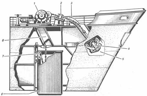 Рис. 3 - Носовое якорное устройство: 1 - якорная лебедка (брашпиль); 2 - стопор для якорной цепи; 3 - труба якорного клюза; 4 - якорь; 5 - якорная ниша; 6 - цепной ящик; 7 - устройство для крепления якорной цепи; 8 - цепная труба. 3. Якорное устройство Якорное устройство, как правило, находится в носу судна. Там же устанавливается и якорная лебедка. Главной частью лебедки является цепная звездочка, позволяющая осуществлять поднятие якоря с цепью, причем при наматывании звенья цепи могут ложиться на цепную звездочку обеими сторонами. Кроме цепной звездочки якорная лебедка имеет еще швартовные барабаны (турачки) для наматывания швартовов. На судах старых типов якорные лебедки имели паровой привод. Сейчас применяют электрические или гидравлические приводы. К носовому якорному устройству относятся два якоря, расположенные по бортам судна. На некоторых судах монтируют также кормовые якорные устройства с одним или двумя якорями. Из-за ограниченной площади для размещения в качестве якорной лебедки используют в основном якорный шпиль. Он представляет собой возвышающийся над палубой барабан с вертикальной осью вращения. Барабан, служащий в качестве лебедки, имеет в нижней части цепную звездочку. Он приводится в движение электродвигателем, смонтированным в барабане или под палубой судна.