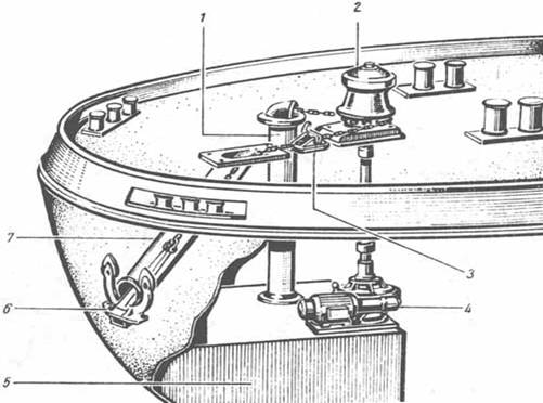Рис. 4 - Кормовое якорное устройство. 1 - цепная труба; 2 - якорный шпиль; 3 - стопор для якорной цепи; 4 - двигатель; 5 - цепной ящик; 6 - якорь; 7 - труба якорного клюза Якоря в зависимости от их назначения разделяют на становые, предназначенные для удержания судна в заданном месте, и вспомогательные - для удержания судна в заданном положении во время стоянки на основном якоре. К вспомогательным относится кормовой якорь - стоп-анкер, масса которого составляет 1/3 массы станового. Размеры, массу и количество якорей назначают по Правилам Регистра в зависимости от размеров корпуса и надстроек судна. Держащая сила якоря в среднем в 10 раз больше его массы. Основными частями якоря являются веретено и лапы. Якоря различают по подвижности и количеству лап (до четырех) и наличию штока. К безлапным относят мертвые якоря (грибовидные, винтовые, железобетонные), используемые при установке плавучих маяков, дебаркадеров и других плавучих сооружений. Якорное устройство. Якорное устройство служит для обеспечения надежной стоянки в море, на рейде и в других местах, удаленных, от берега, путем крепления за грунт с помощью якоря и якорной цепи. В его состав входят: якоря, якорные цепи (канаты), якорные машины, якорные клюзы и стопоры. На морских судах в качестве становых и стоп-анкеров применяют двулапые якоря: бесштоковые, с поворотными лапами - якоря Холла, Грузона - и штоковые, с неподвижными лапами - адмиралтейские. Штоковые якоря обладают значительно большей держащей силой, чем бесштоковые (у адмиралтейского она равна 10 - 12 массам самого якоря), но наличие штока затрудняет их уборку и отдачу. Поэтому на крупных судах, как правило, применяют тяжелые бесштоковые якоря Холла, легко убираемые в клюзы. Существуют якоря повышенной держащей силы - с поворотными лапами и штоком в виде поперечных утолщений на лапах. К этому типу относят якорь Матросова, применяемый на катерах и буксирах. На малых судах и баржах используют многолапные бесштоковые якоря, называемые кошками. Суда ледового плавания снабжают специальными однолапыми бесштоковыми ледовыми якорями, предназначенными для удержания судна у ледового поля. 4. Маркировка якорной цепи Якорная цепь служит для крепления якоря к корпусу судна. Она состоит из звеньев, образующих смычки длиной 25-27 м, соединенные одна с другой при помощи специальных разъемных звеньев. Смычки образуют якорную цепь длиной от 50 до 300 м. В зависимости от расположения в якорной цепи различают якорную (крепящуюся к якорю), промежуточные и коренную смычки. Крепят якоря к якорной цепи при помощи якорных скоб. Чтобы предупредить скручивание цепи, в нее включают поворотные звенья - вертлюги. Для крепления и экстренной отдачи коренного конца якорной цепи применяют специальное устройства с откидным гаком - глаголь-гак, позволяющим легко освободить судно от вытравленной якорной цепи. По Правилам Регистра устройство для быстрой от дачи якорной цепи, устанавливаемое в цепном ящике, должно иметь дистанционный привод управления, выведенный на открытую или другую палубу в доступном месте. Якорные цепи различают по их калибру - диаметру поперечного сечения прутка звена. Звенья цепей калибром более 15 мм должны иметь распорки - контрфорсы. У крупнейших судов калибр якорных цепей достигает 100 -130 мм. В походном положении якорную цепь хранят в цепном ящике 