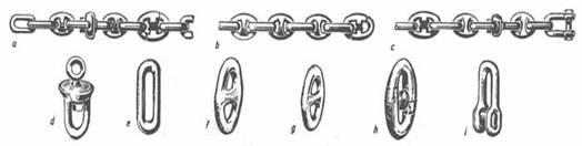 Рис. 5 - Якорная цепь: а - смычка якорной цепи (с якорной скобой); b - промежуточная смычка; с - коренная смычка; d - вертлюг; е - длинное звено; f - большое звено; g - обыкновенное звено; h - звено с распоркой; i - концевая скоба Якорная цепь состоит из отдельных звеньев; несколько соединенных между собой звеньев образуют смычку. Отдельные смычки соединяются при помощи соединительных звеньев. Якорь и якорная цепь соединяются друг с другом якорной скобой с вертлюгом, позволяющей цепи вращаться вокруг своей оси. Цепь проходит через углубление в борту у клюза для якоря, через стопор, препятствующий самопроизвольному вытравливанию цепи, и наматывается на цепную звездочку якорной лебедки. Другой конец якорной цепи находится в цепном ящике и прикрепляется к судну посредством скобы. Смычка - отрезок якорной цепи длиной 23-27 м. Смычки соединены между собой скобами или разъемными звеньями. Различают: - коренную смычку, соединенную с корпусом судна; - якорную смычку, соединенную с якорем; - промежуточные смычки. Якорная скоба - скоба для соединения якоря с якорной цепью. 5. Классификации якорных устройств Якорное устройство - судовые средства, предназначенные для постановки судна или другого плавучего объекта на якорь и закрепления (удержания) его в заданном районе акватории за счет собственных средств. В истории не сохранилось точных данных о времени появления первых якорных устройств, однако археологи полагают, что предшественником якорного устройства был массивный якорный камень с гибким канатом. Якорное устройство современного судна (корабля) включает в себя следующие элементы и детали: