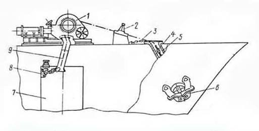 Рис. 6 - 1) Якорный механизм - устройство для подъема и отдачи (стравливания якоря); 2) и 3) якорные и цепные стопоры, служащие для закрепления якорного каната, как при стоянке на якоре, так и в "походном" положении; 4) якорный канат, передающий усилие от корпуса судна к якорю и используемый для подъема и отдачи якоря; 5) якорные клюзы позволяющие проходить якорному канату при отдаче и подъему якоря; 6) якорь, обеспечивающий удержание судна в заданном положении; 7) цепной (канатный) ящик для размещения якорного каната; 8) жвакогалс - устройство для крепления коренного конца якорь цепи к корпусу судна; 9) палубный клюз для прохода якорь цепи от брашпиля в цепной (канатный) ящик Якорные устройства можно разделить по следующим признакам: по назначению и условиям эксплуатации различают якорные устройства морских транспортных, промысловых и пассажирских судов, плавучих маяков, причалов и молов, морских навигационных буев и буйковых станций: глубоководные якорные устройства специальных судов; якорные устройства плавучих буровых платформ, плавучих доков, дноуглубительных снарядов и рейдового оборудования. По месту расположения на судне различают носовые и кормовые якорные устройства.