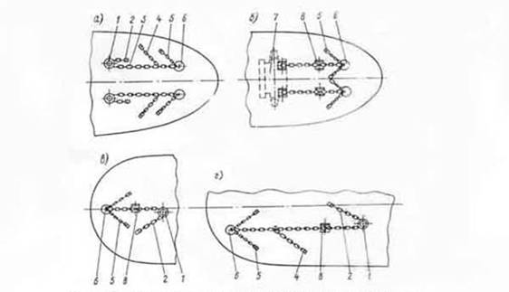 Рис. 7 - Носовое и кормовое якорные устройства: а – носовое якорное устройство со шпилями; б – носовое якорное устройство с брашпилем; в – кормовое якорное устройство с клюзом в ДП; г - кормовое якорное устройство с клюзом в стороне от ДП. 1 – шпиль, 2 – цепной клюз; 3 – лоток; 4 – стояночный стопор; 5 – стопор для крепления якоря по-походному; 6 – клюз; 7 – брашпиль; 8 – цепной стопор По типу якорных механизмов, судовые якорные устройства разделяют на устройства с брашпилем, со шпилями или якорными (якорно-швартовными) лебедками.