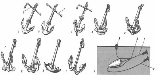 Рис 2 а - камень, обвязанный канатом; б - примитивный; в - индийский; г - китайский; д - адмиралтейский; е - бесштоковый; ж - вильчатый; з - Портера; и - грибовидный; к - плуговый; л - Нортилла; м - Дэнфорта Якорная цепь состоит из отдельных звеньев; несколько соединенных между собой звеньев образуют смычку. Отдельные смычки соединяются при помощи соединительных звеньев. Якорь и якорная цепь соединяются друг с другом якорной скобой с вертлюгом, позволяющей цепи вращаться вокруг своей оси. Цепь проходит через углубление в борту у клюза для якоря, через стопор, препятствующий самопроизвольному вытравливанию цепи, и наматывается на цепную звездочку якорной лебедки. Другой конец якорной цепи находится в цепном ящике и прикрепляется к судну посредством скобы.